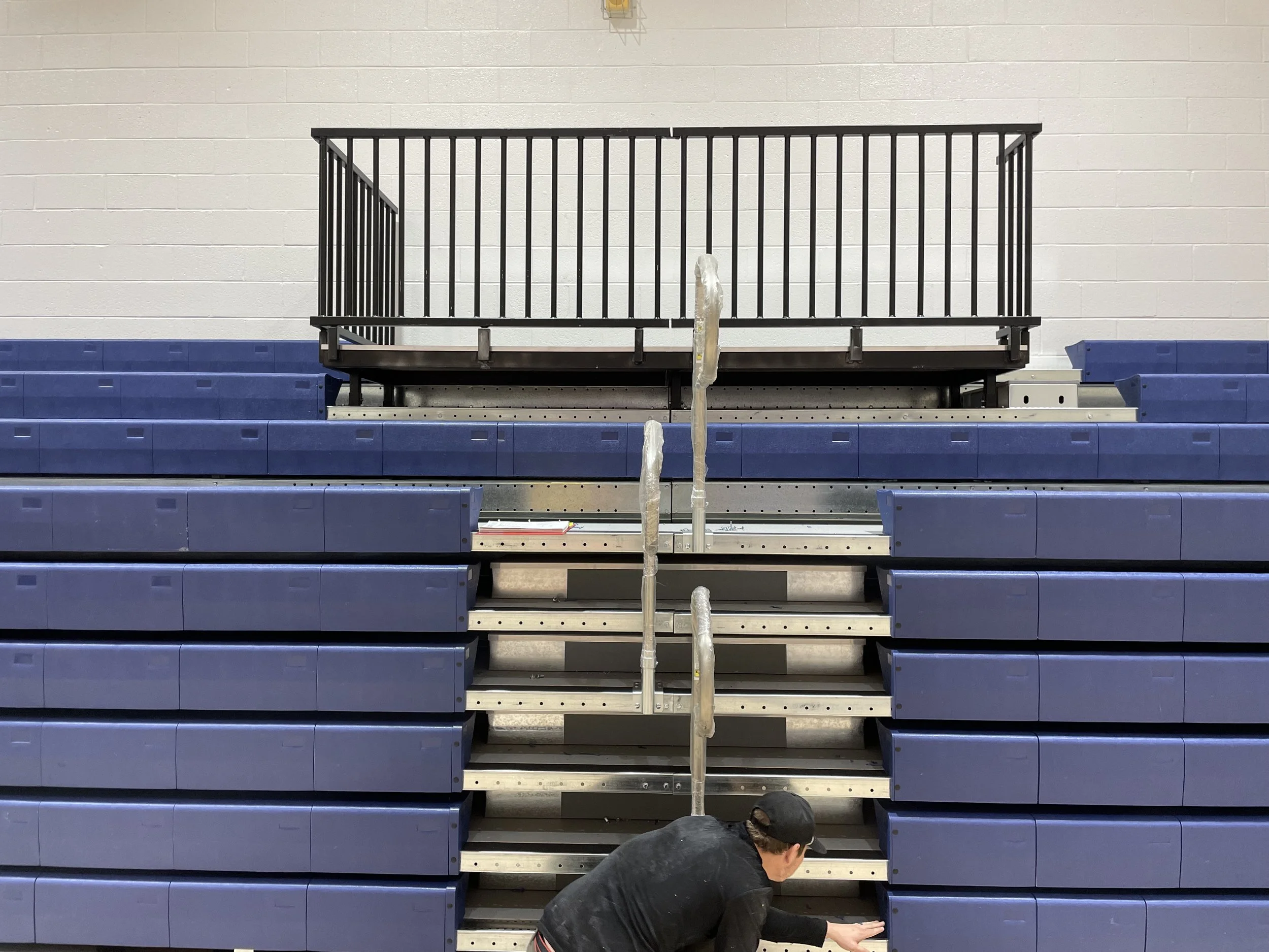 Bleachers are fully extended and retracted to evaluate operation, alignment, and movement. Adjustments are made to ensure smooth, safe, and consistent function.